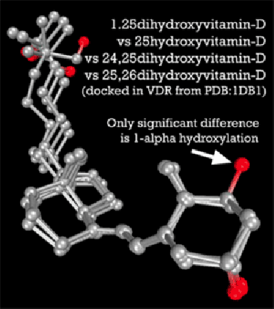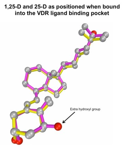 Als we supplementen nemen met de bedoeling de waarde van die 25-D te verhogen, dan vergroten we daarmee de concurrentie en hinderen we de activatie van deze belangrijke receptor! Het volgende plaatje laat zien hoe deze twee vitamine D-metabolieten om de Vitamine D-Receptor kunnen concurreren. Ze zouden zich op dezelfde manier in de receptor nestelen. Die receptor wordt dan verminderd geactiveerd.