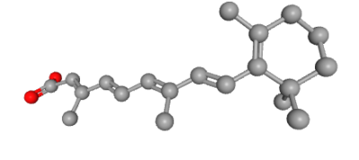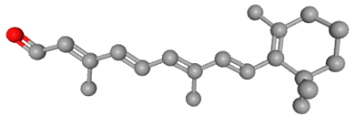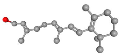 Ook de ingenomen stofjes die we als vitamine A binnenkrijgen zijn niet de stofjes die de bijbehorende receptor activeren. Het activerende stofje dat de receptor wel activeert is retinezuur en dat wordt in het lijf zelf gemaakt. Het heeft twee zuurstofatomen waarmee de genexpressie in gang wordt gezet. De animatie laat het retinezuur-molecuul zien in de receptor.2)