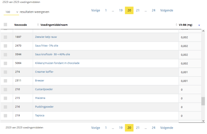Als we even kijken bij NEVO Online dan zien we dat we zelfs helemaal naar pagina 20 van 24 moeten klikken om een voedingsmiddel tegen te komen zonder B6. In Nederland is het echt heel erg moeilijk om te weinig B6 binnen te krijgen.
